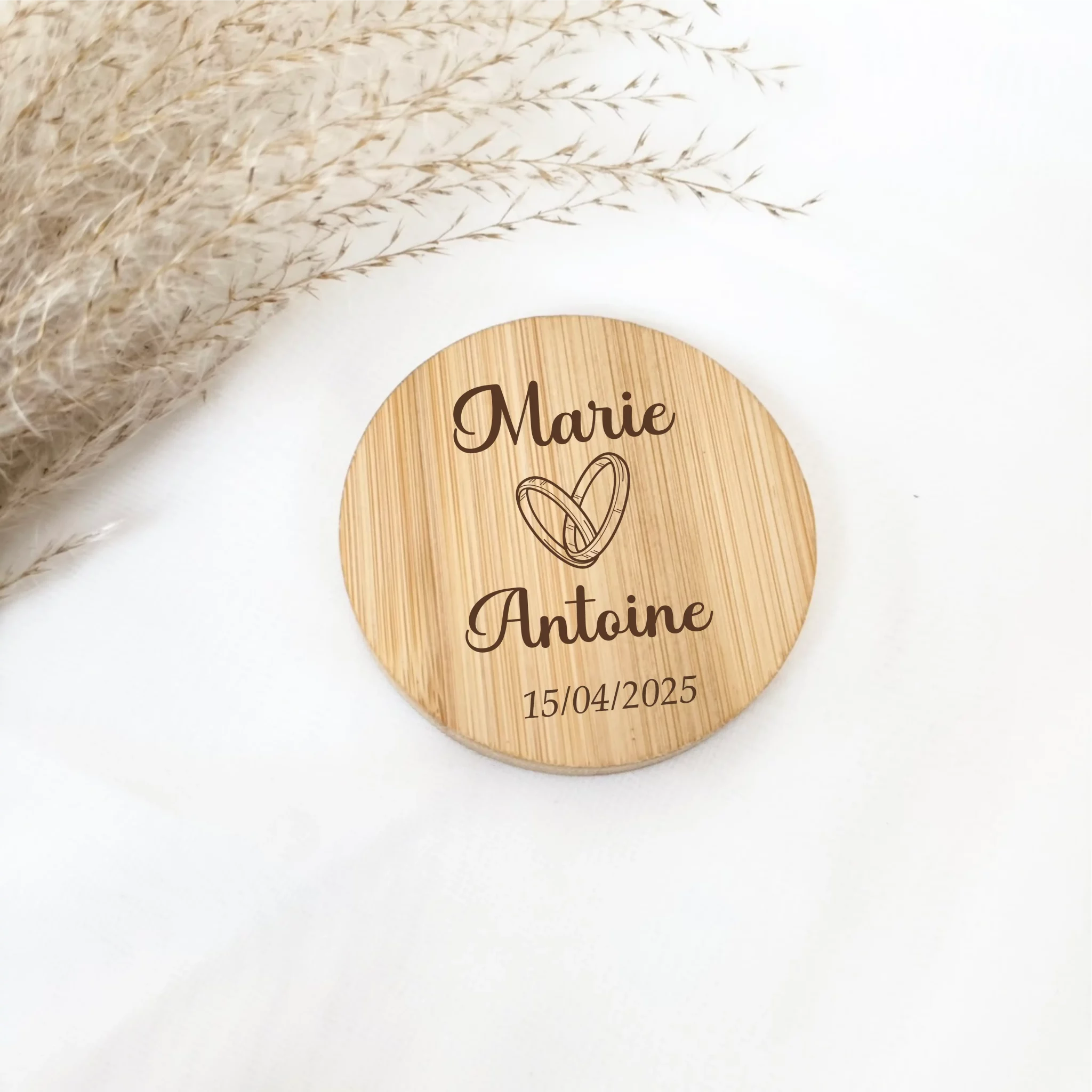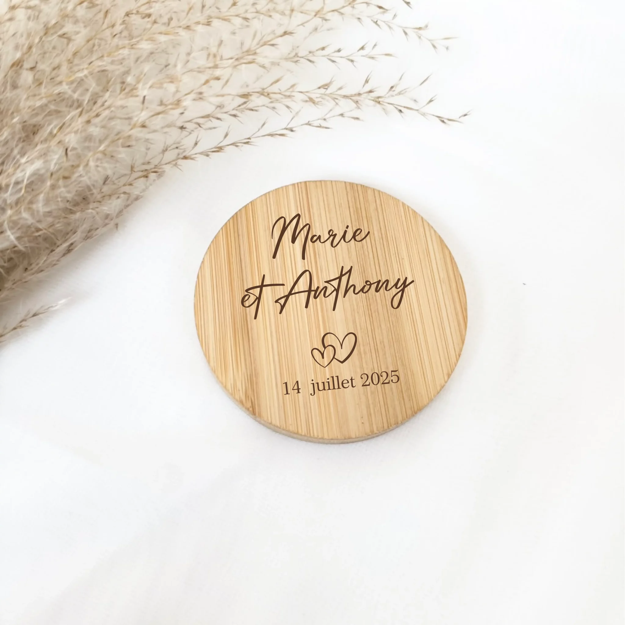 Gravez-y vos prénoms, la date du mariage ou un petit mot doux pour offrir à chaque convive un souvenir unique et personnalisé. Chaque pièce est gravée avec soin dans notre atelier.