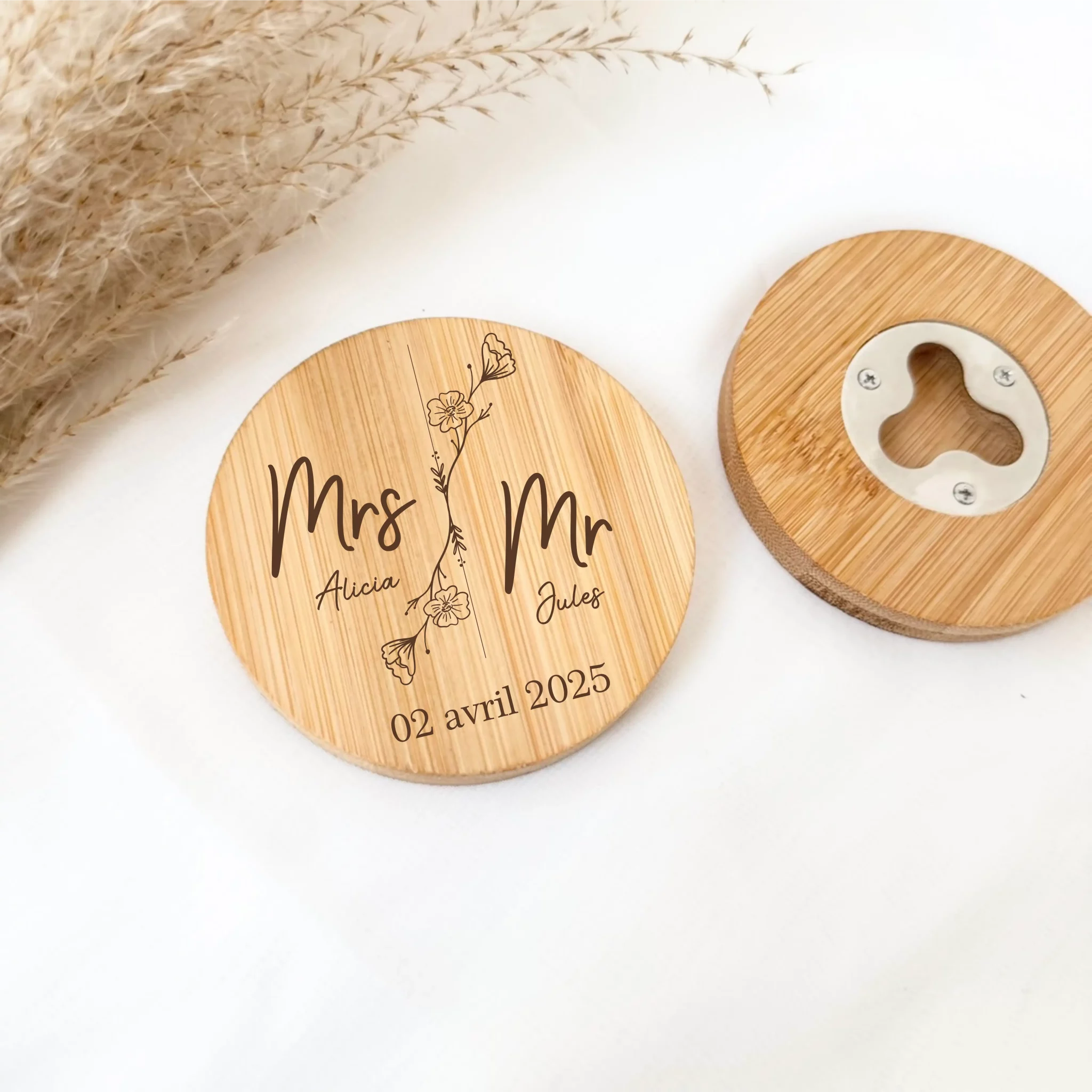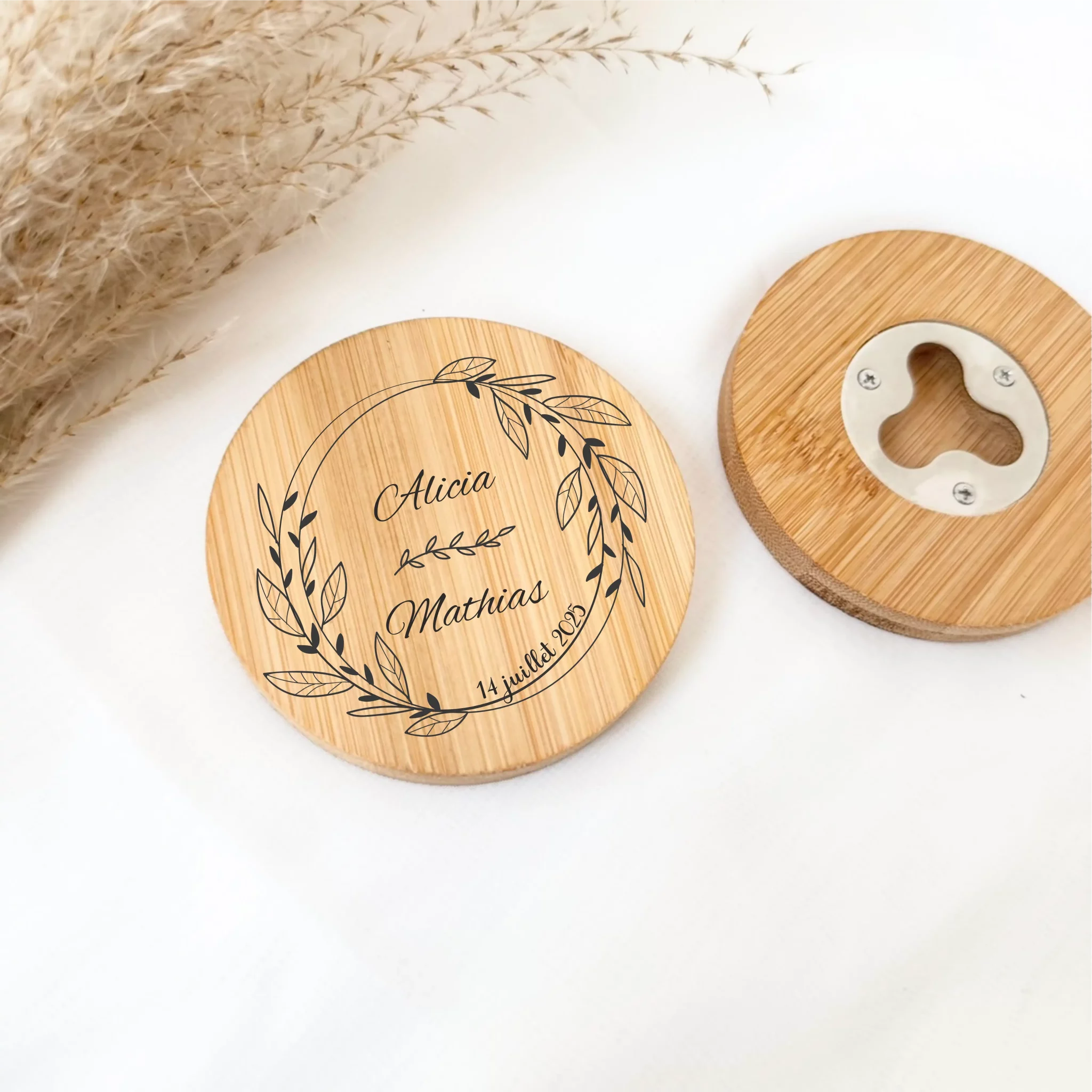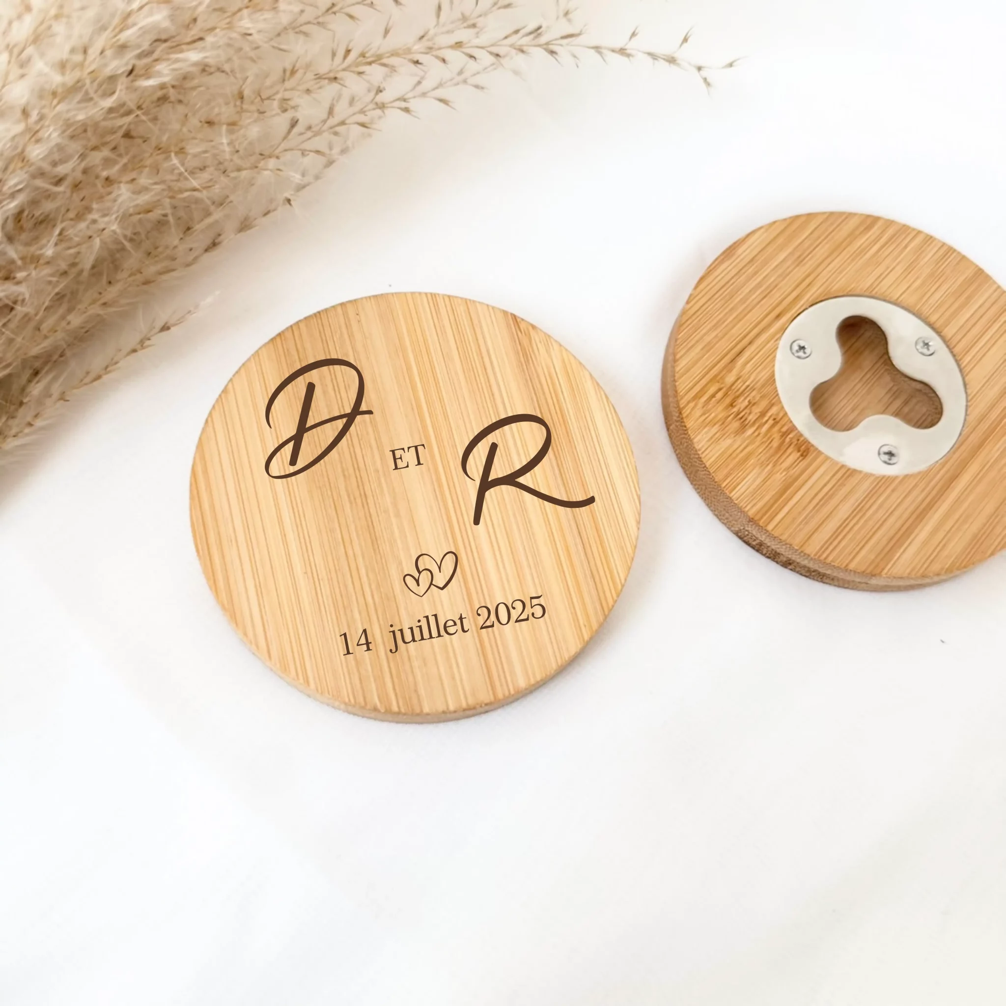Ajoutez une touche authentique et utile à votre décoration de mariage avec ce joli décapsuleur en bambou, qui fait aussi office de sous-verre. À la fois pratique, esthétique et respectueux de l’environnement, c’est le petit cadeau parfait pour remercier vos invités tout en sublimant vos tables.